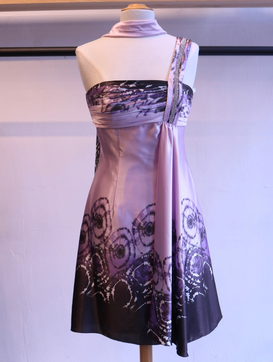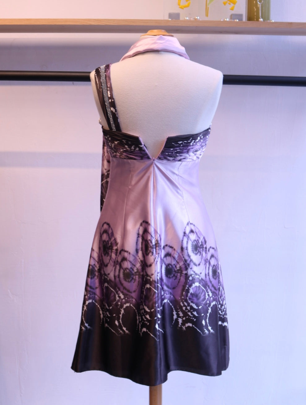 Deze unieke paarse galajurk valt op door de bijzondere print en het elegante one-shoulder ontwerp. Het voorgevormde borstgedeelte biedt een mooie pasvorm, terwijl de aansluitende snit het silhouet verfijnt. Een strassdetail op de band zorgt voor extra glamour. De jurk is volledig gevoerd en sluit met een blinde rits voor een strakke afwerking.