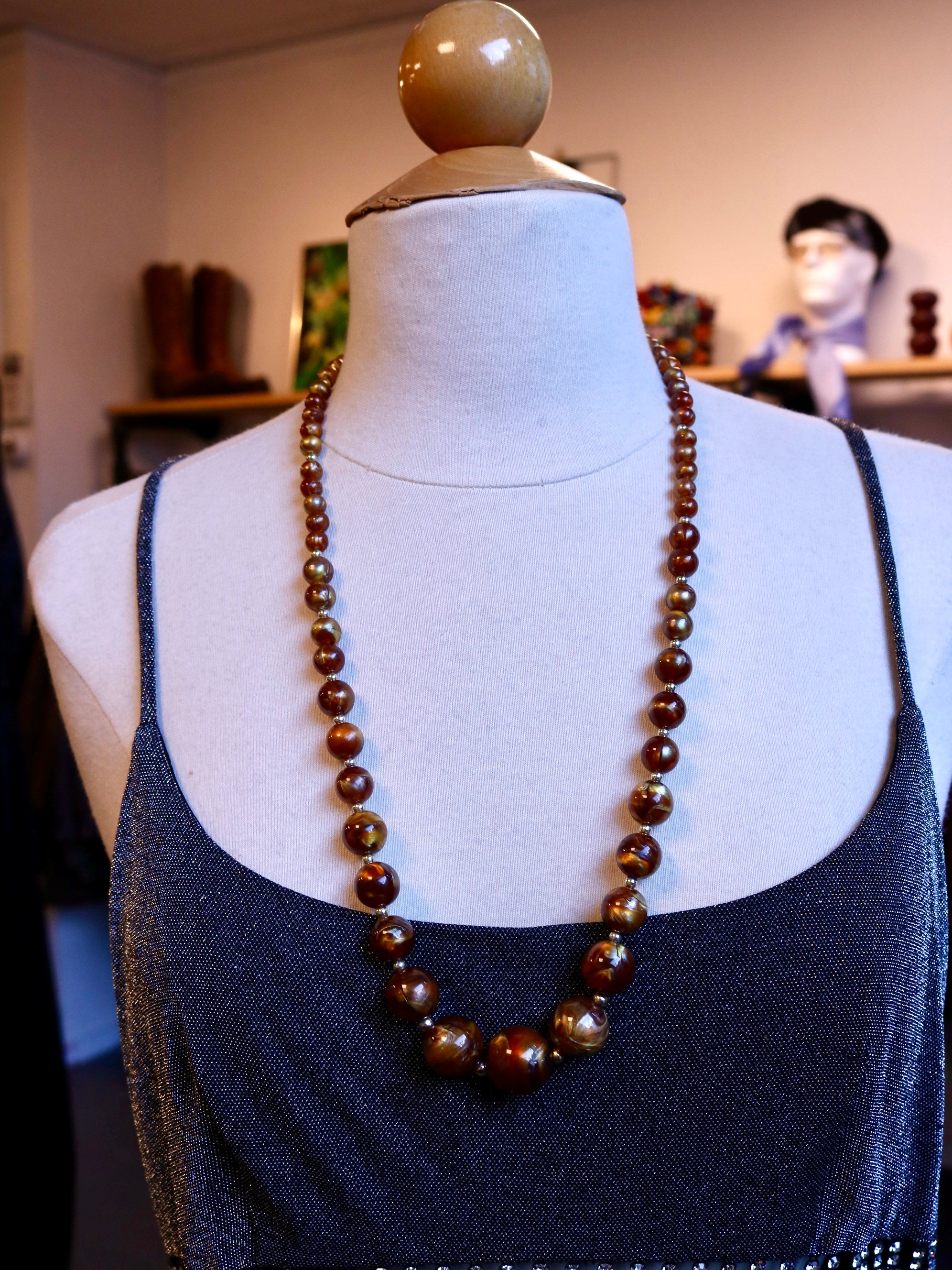 Kralenketting met bruin parelmoer kralen afgewisseld door kleine goudkleurige kralen.