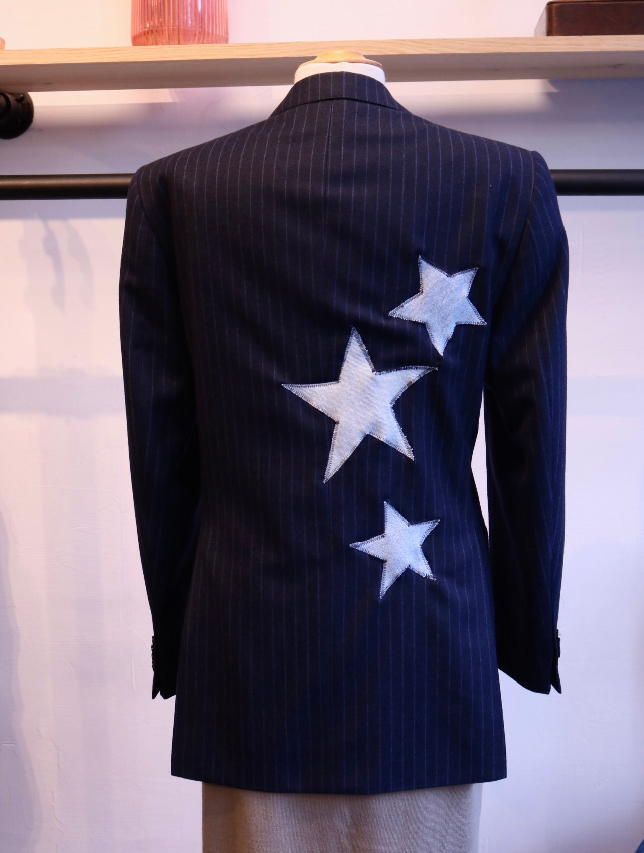 Een opvallende blazer met opgestikte denimsterren. De elegante blauwe kleur met subtiele krijtstreep geeft een tijdloze uitstraling. Dankzij het unieke design is deze blazer moeiteloos te combineren voor zowel een casual als een geklede look.