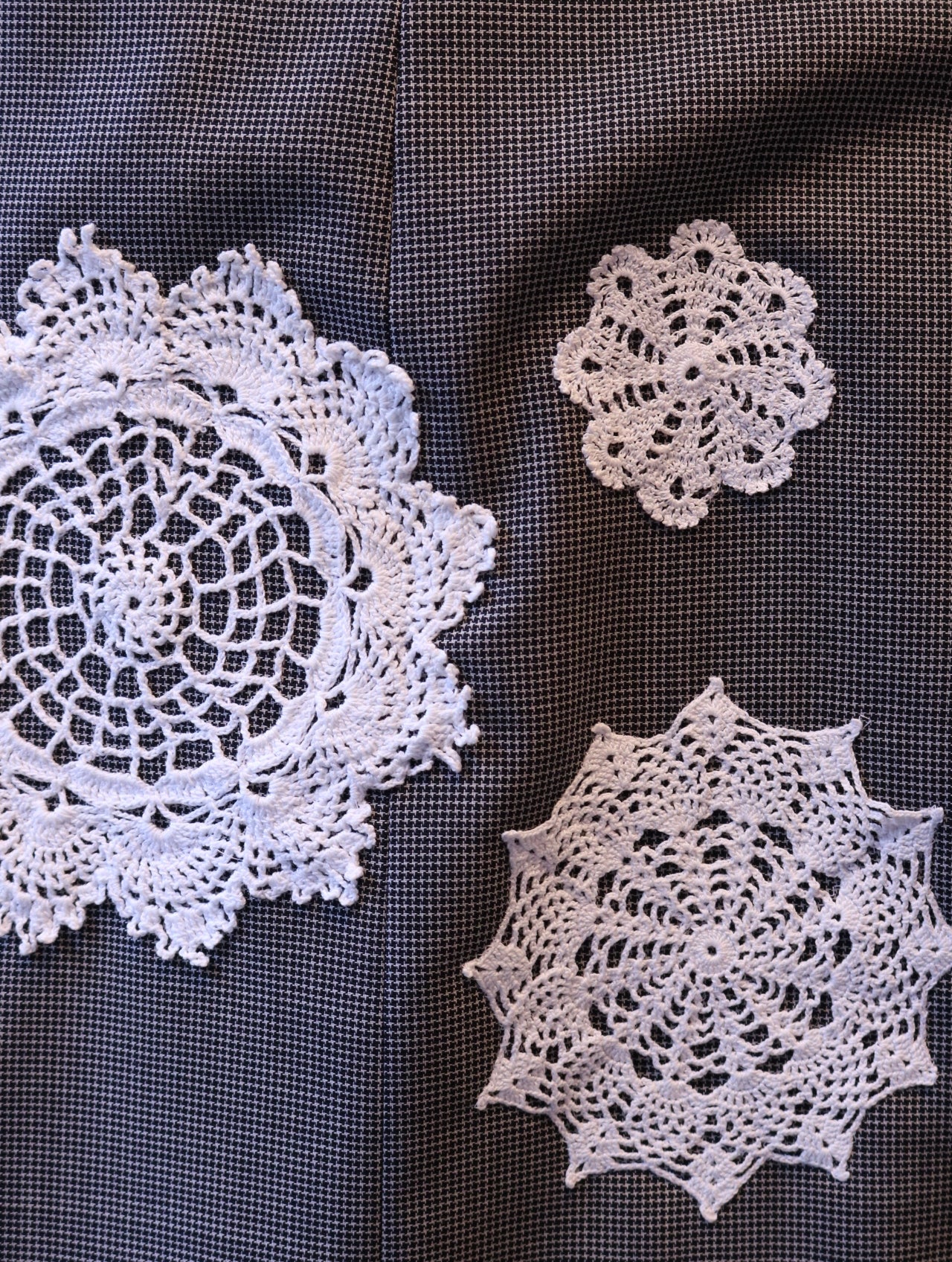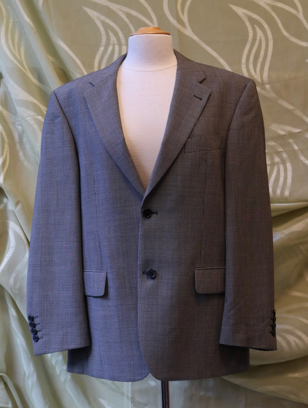 Reworked blazer met een pied-de-poule ruit in de stof. De met kant opgestikte achterkant geeft de blazer een unieke uitstraling. Elk hoekje is zorgvuldig opgestikt, zodat het kant mooi blijft zitten.