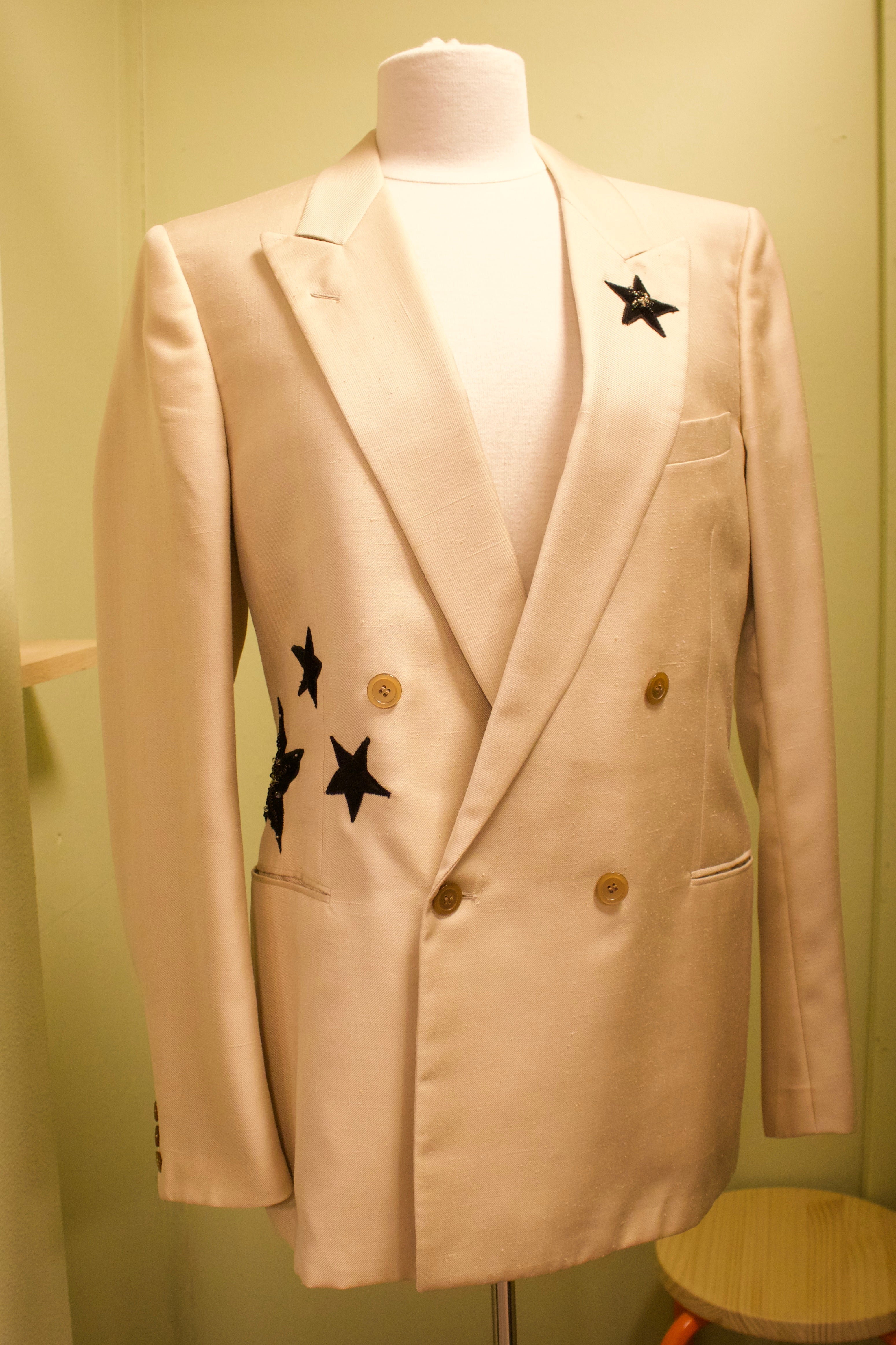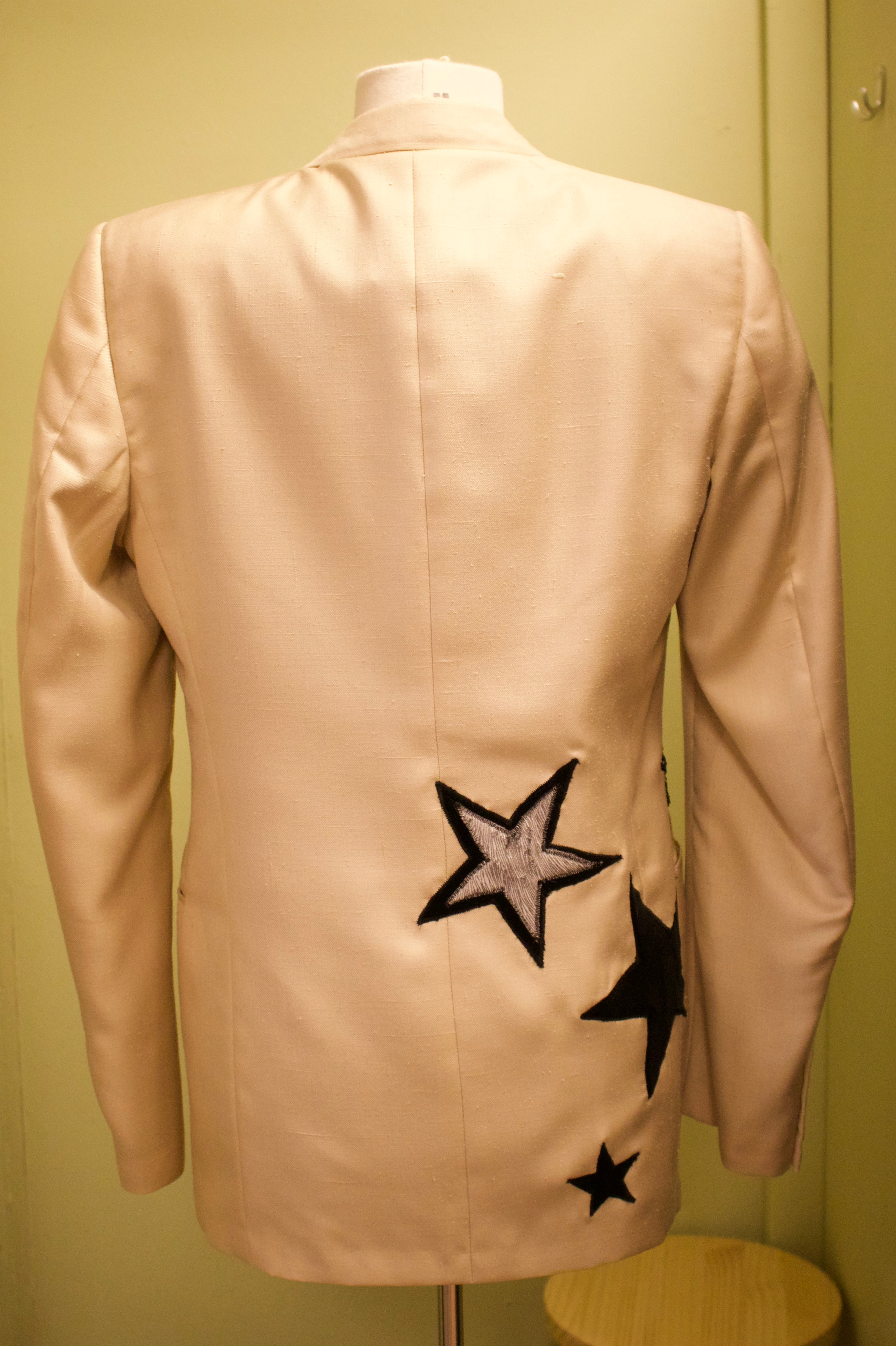 Reworked blazer in een beige kleur. Op de blazer zijn velours zwarte -en een zilveren- sterren gestikt met op een aantal sterren geborduurde kralen. Het jasje zelf is van een zijde blend, dus een mooi luxe jasje.